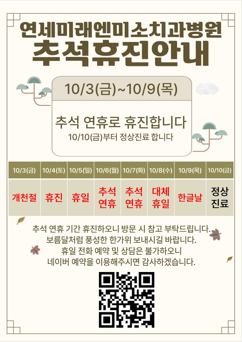 2025년 추석 연휴 10/3(금) ~ 10/9(목) 병원 휴진 합니다. [*10/10 (금)부터 정상 진료 합니다.] 일정을 참고하시어 내원 및 예약에 불편 없으시길 바랍니다.